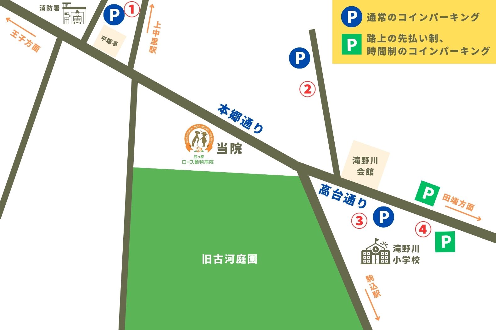 - カーナビは「西ヶ原ローズ動物病院」もしくは「旧古河庭園」「滝野川会館」でお探しください。