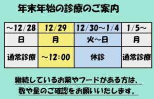早いもので今年も師走となりました。年末年始はお休みをします。 12/28(土)までは通常診療12/29(日)午前診療のみ(9:00-12:00)12/30(月)~1/3(金)休診1/4 (土)から通常診療 休診中に受診が […]